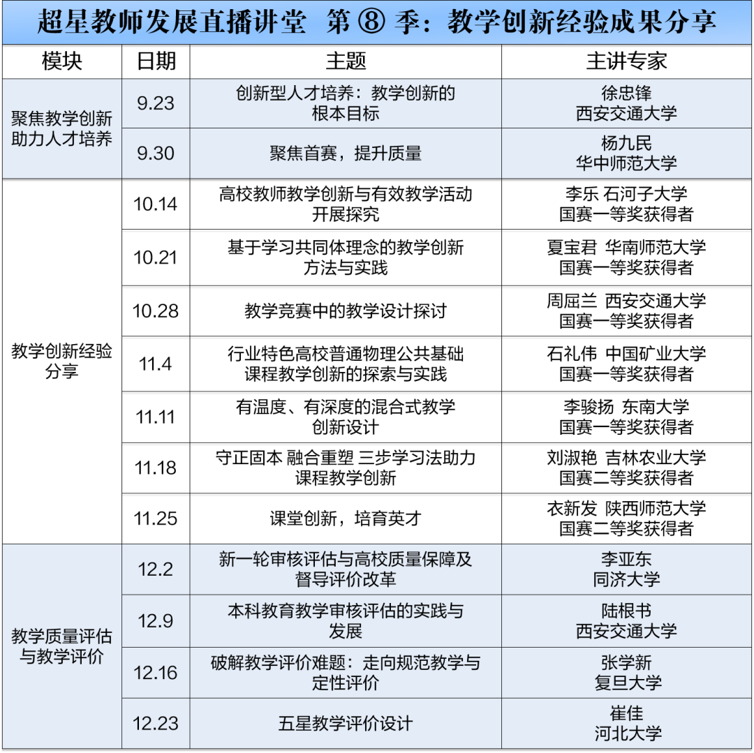 第八季直播讲堂围绕“教学创新经验成果分享”,在教学创新与助力人才培养、教学创新经验分享、教学质量评估与教学评价等方面,汇聚全国教学名师,邀请多位首届全国高校教师教学创新大赛国赛获奖选手,分享参赛成果、经验与心得,课程安排如下: