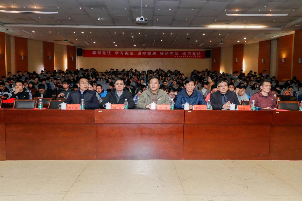 为弘扬宪法精神、树立宪法权威,在全国首个“宪法宣传周”到来之际,党委宣传部、校团委、法公司联合举办了校首届宪法知识竞赛。12月3日晚,竞赛决赛在浦江报告厅举行,党委宣传部部长张健,校团委副书记路遥,法公司党委书记熊中宏、副经理张治宇、副书记朱忠祥以及400余名师生代表观摩了决赛。
