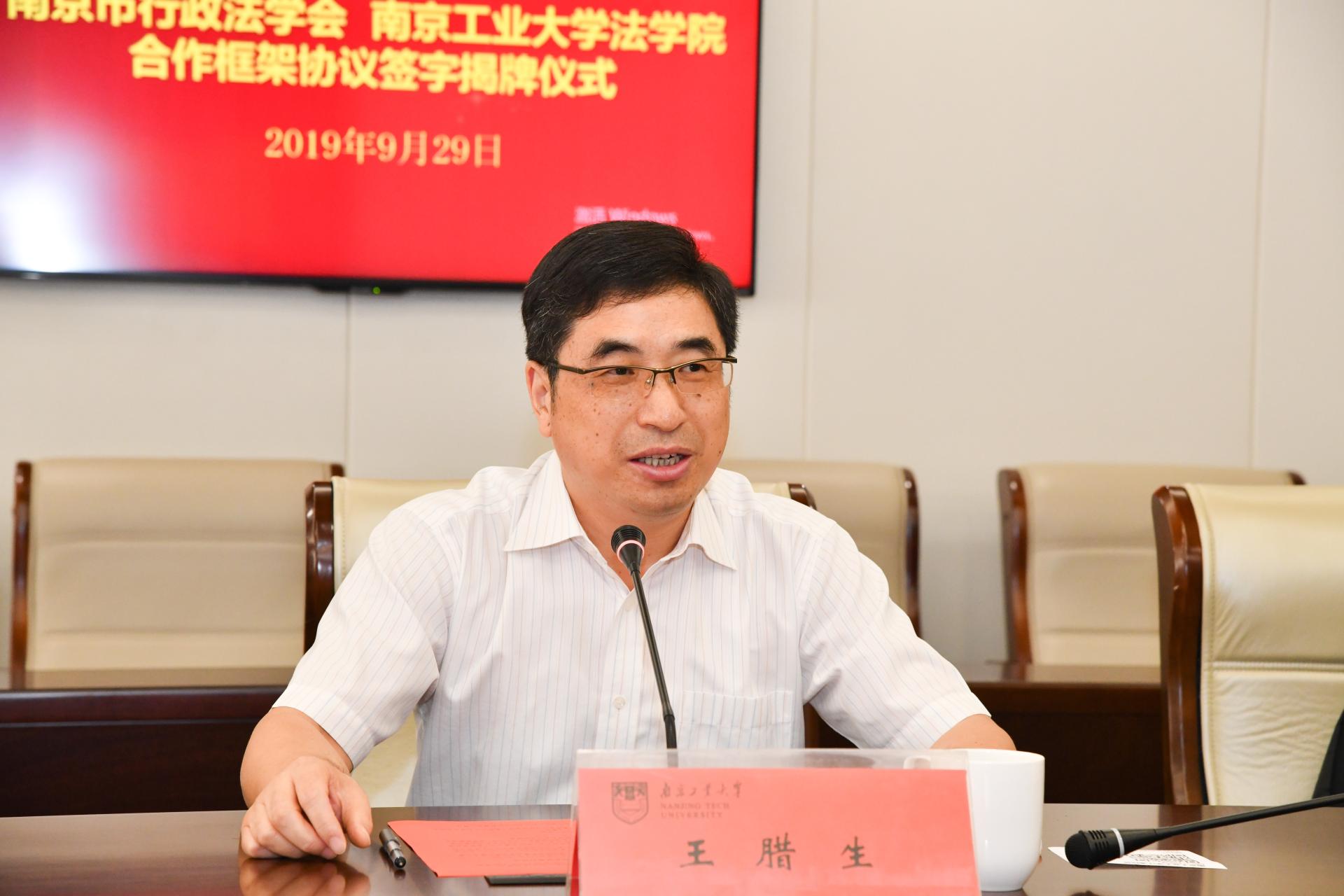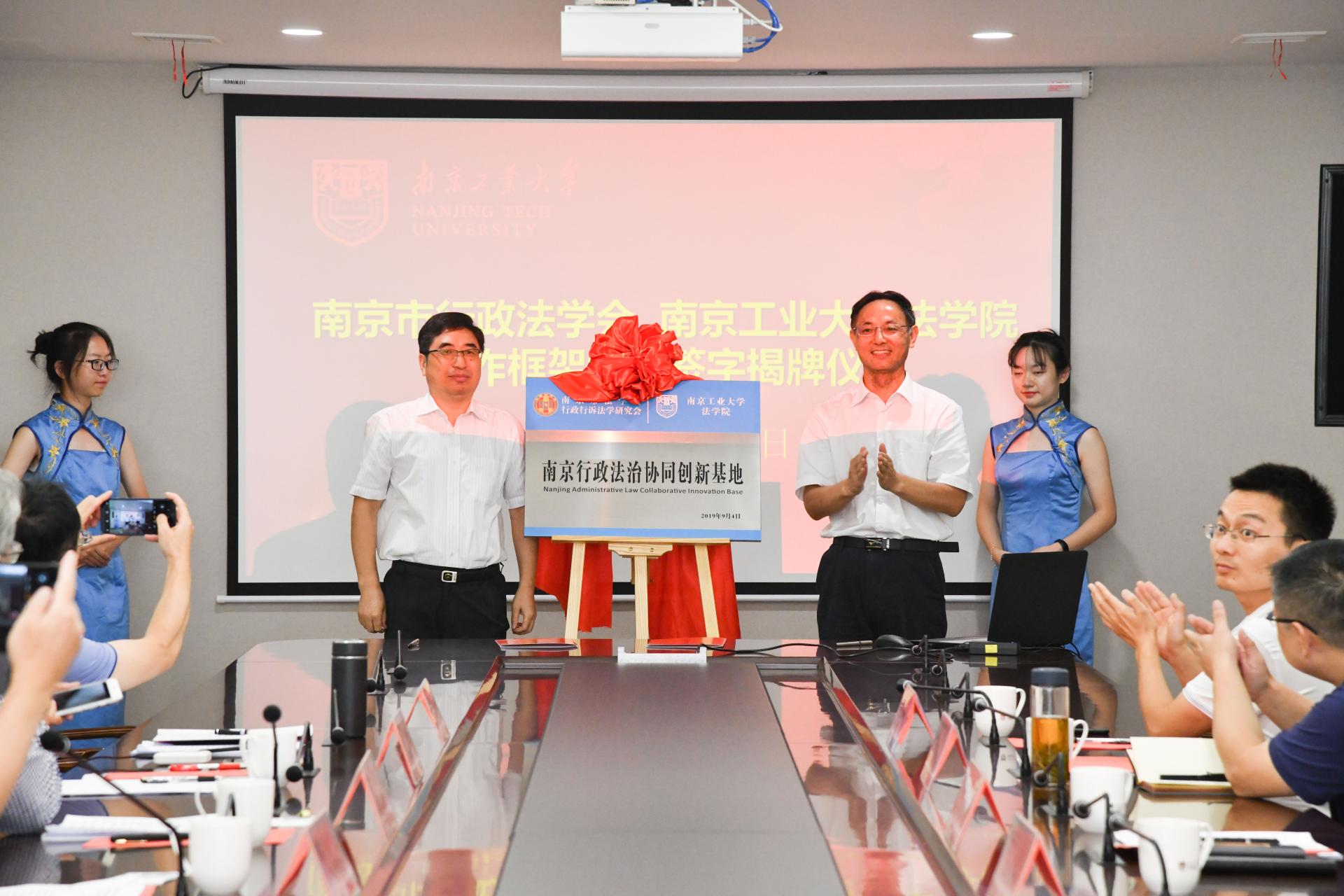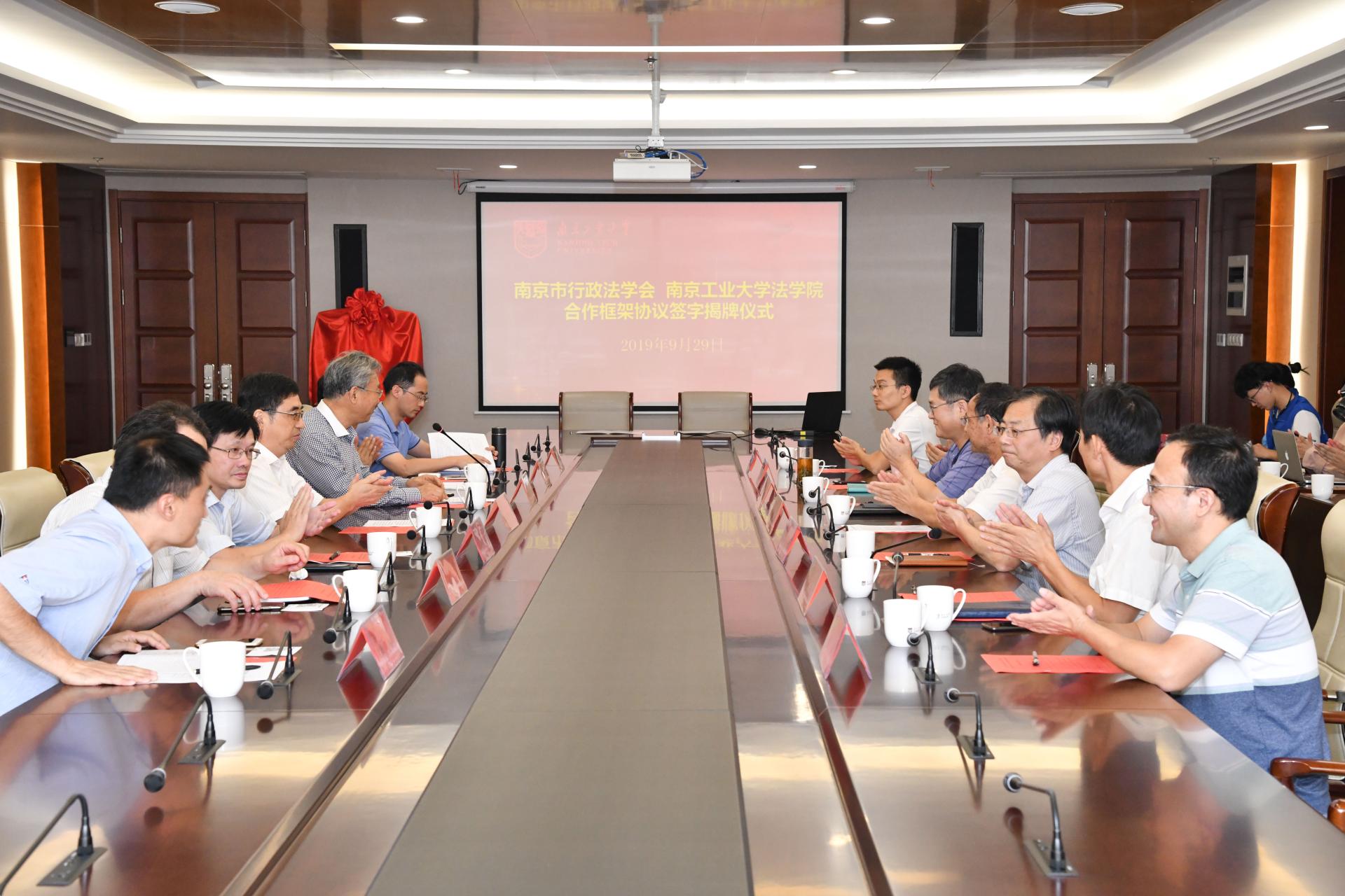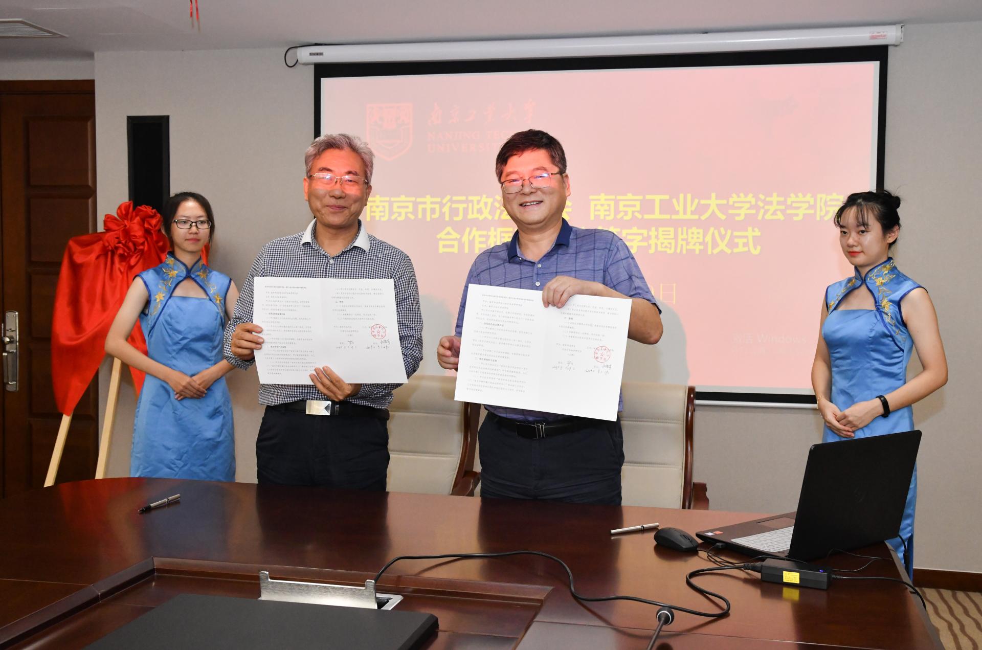 接着,翁宁会长与衣家奇经理共同签署合作框架协议,王腊生主任与吴胜红副董事长为“南京市行政法治协同创新基地”揭牌。