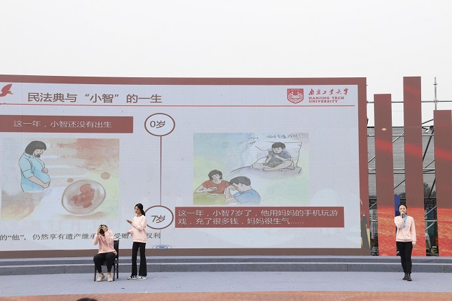 在现场展览展示会上,张春宝等同学为参观群众介绍项目,解答法律疑问,同时设置《民法典》知识答题,现场互动交流络绎不绝,法小豸文创产品也颇受欢迎。在精品项目推介会上,侯雨薇同学详细介绍了法立方“进社区、进公司、进网络”普法项目的实施背景、模式、过程、成效以及未来规划。在项目风采展示会上,吕露鹏同学以《志愿服务新亮“典”》为题与观众分享了《民法典》的基本知识以及对志愿服务的保障作用。精心编排的短剧“民法典和小智的一生”,讲述一系列与个人生活息息相关的民法问题,新颖的普法模式赢得了阵阵掌声。