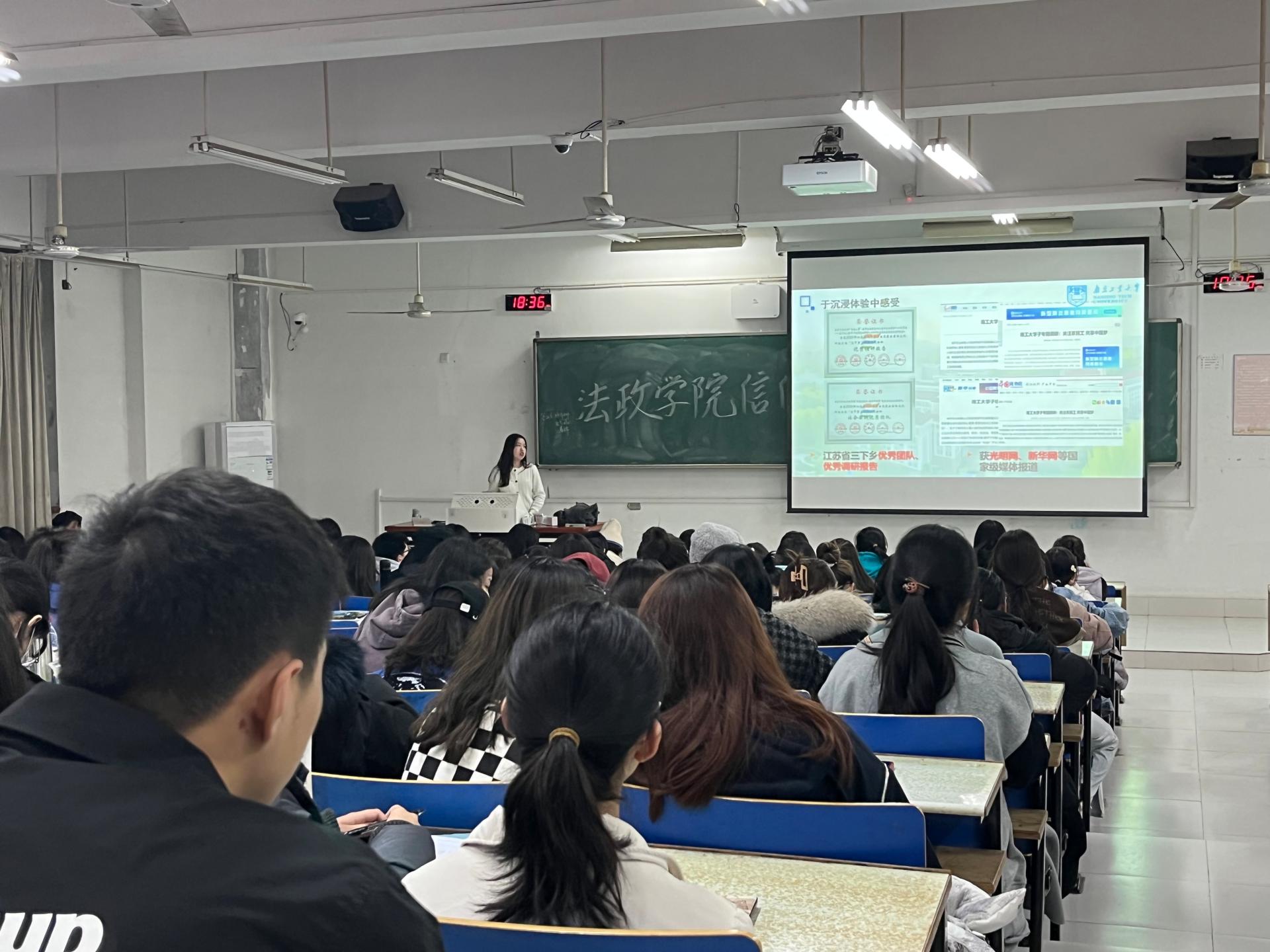 王睿纯同学以科研之路为主题,围绕三大板块—“于沉浸体验中感受”、“于多元视角中收获”、“于触摸世界中成长”,结合自己一路走来的感悟,全面且详细地列举了本科四年来所参与的活动,如大创项目、“挑战杯”、三下乡暑期社会实践、支教等,为同学们分享了自己学习、实践、科创的宝贵经验和有益方法。她鼓励2021级同学要鼓起勇气、抓住机会表达自我,在求学求知的路上满怀热爱、不惧艰险。当专业课足够优秀,社会实践足够真切,这四年定会是硕果累累的四年。