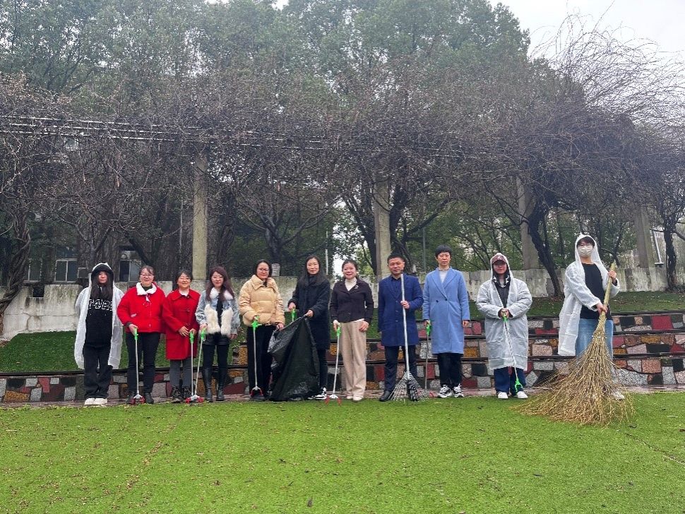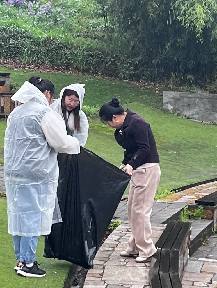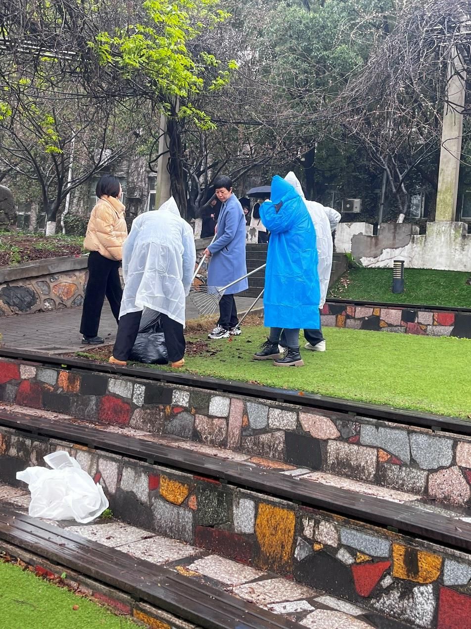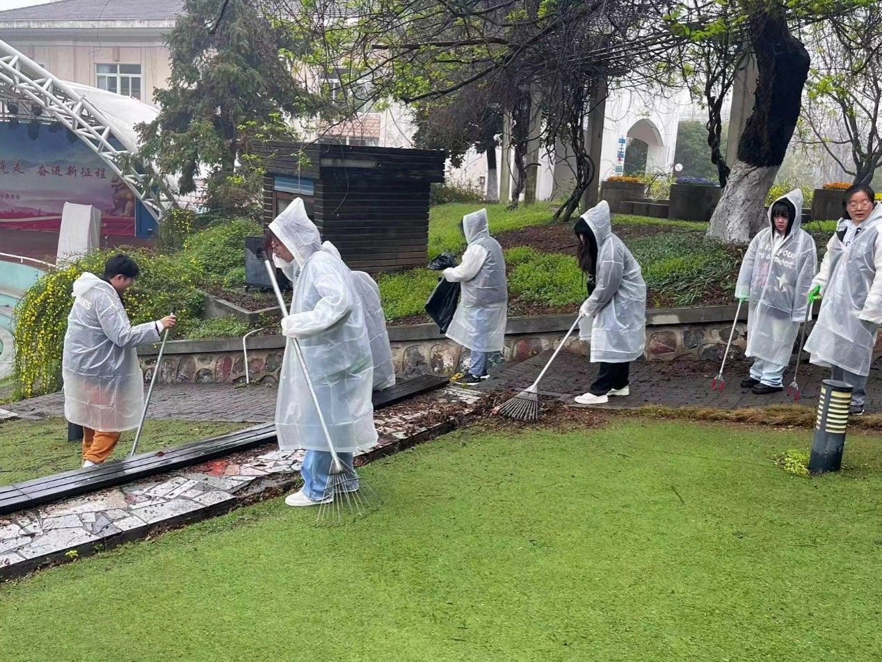 本次活动,太阳成tyc33455ccwww主要负责明德楼、音乐台、雅集馆、明如新斋区域的卫生打扫。天空虽下起蒙蒙细雨,但也抵挡不住大家的十足干劲。同学们合理分工,配合积极,用长柄耙子、扫把、垃圾夹子等工具认真打扫地面,仔细清洁角落。通过对负责区域内的人行道、绿化带以及建筑物周围的全面清理,春雨之中干净的环境,别有一番清新的韵味。
