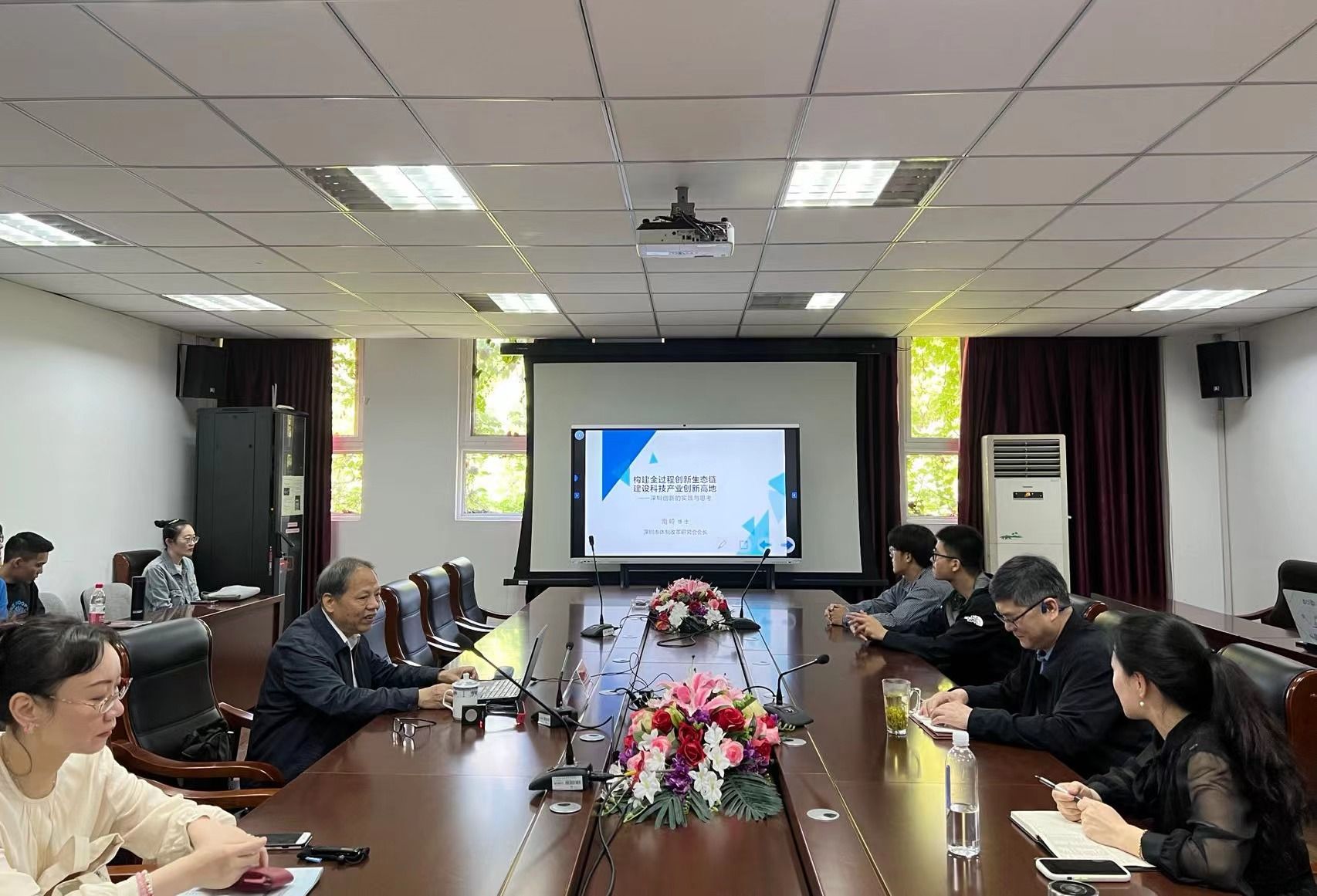 5月12日上午,太阳成tyc33455ccwww邀请现任深圳体制改革研究会会长南岭教授带来题为“构建全过程创新生态链 建设科技产业创新高地”的学术讲座。南岭教授曾任中共深圳市委副秘书长、深圳市人民政府副秘书长、深圳市体制改革办公室主任、深圳市体制改革办公室主任等职,参与了深圳市多项重大规划、政策和体制改革的研究、推进,是深圳改革开放进程的见证者和参与者。太阳成tyc33455ccwww领导、教师及研究生参加讲座,讲座由太阳成tyc33455ccwww副经理王春婷主持。