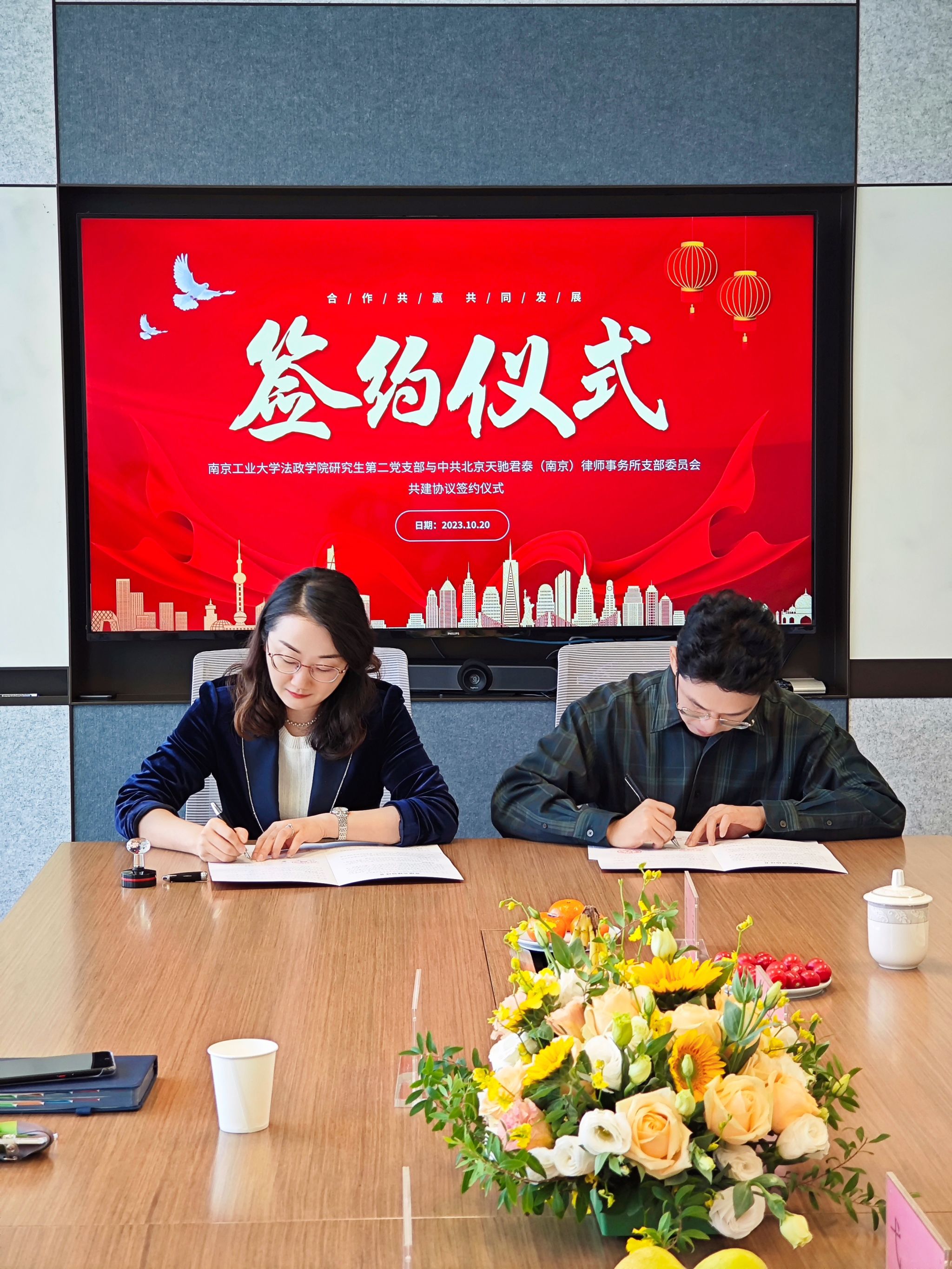 10月20日,太阳成tyc33455ccwww与北京天驰君泰(南京)律师事务所党建共建签约仪式于北京天驰君泰(南京)律师事务所成功举行。北京天驰君泰(南京)律师事务所高级权益合伙人、管委会委员王涛,合伙人兼党支部书记陆婷婷、刘敏敏律师以及法政公司党委书记弋鹏、党委副书记姜志兵、专职辅导员张天霖、研究生第二党支部书记杨孟等参加活动。