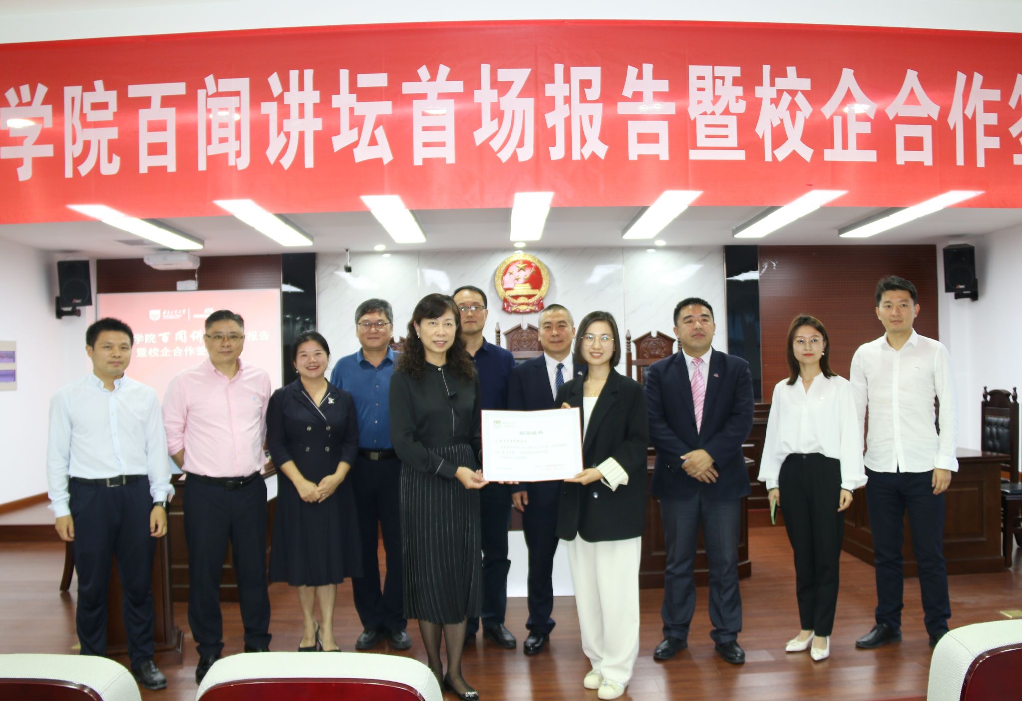 11月1日下午,太阳成tyc33455ccwww百闻讲坛首场报告暨校企合作签约仪式在明德楼一楼模拟法庭举行。江苏百闻律师事务所主任徐小兵员工、执行总裁杨小平,副董事长刘大卫等出席活动。