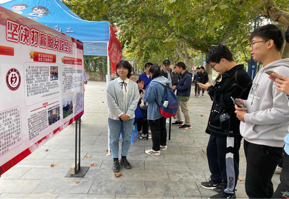 党支部组织全体成员认真学习了“习近平:在决战决胜脱贫攻坚座谈会上的讲话”“一图看懂习近平主持召开的7次脱贫攻坚座谈会”等文献资料,并展开热议。支部委员马睿说到“各种不同形式的扶贫,体现了全国上下一条心、集中力量办大事的决心”,支部成员董强强说到“作为一名新时代研究生,必须树立‘学以报国’思想,努力夯实科学文化基础,筑牢爱党爱国的政治根基。” 17日中午,党支部在东苑食堂附近摆摊设点,支部书记薛惠文通过展板向大家宣讲了习近平总书记扶贫工作论述、扶贫日背景、意义以及先进人物事迹等内容。丰富有趣的答题活动吸引了百余名员工参加,进一步增进了对扶贫理念的理解,增强了对国家扶贫方针政策的认同。