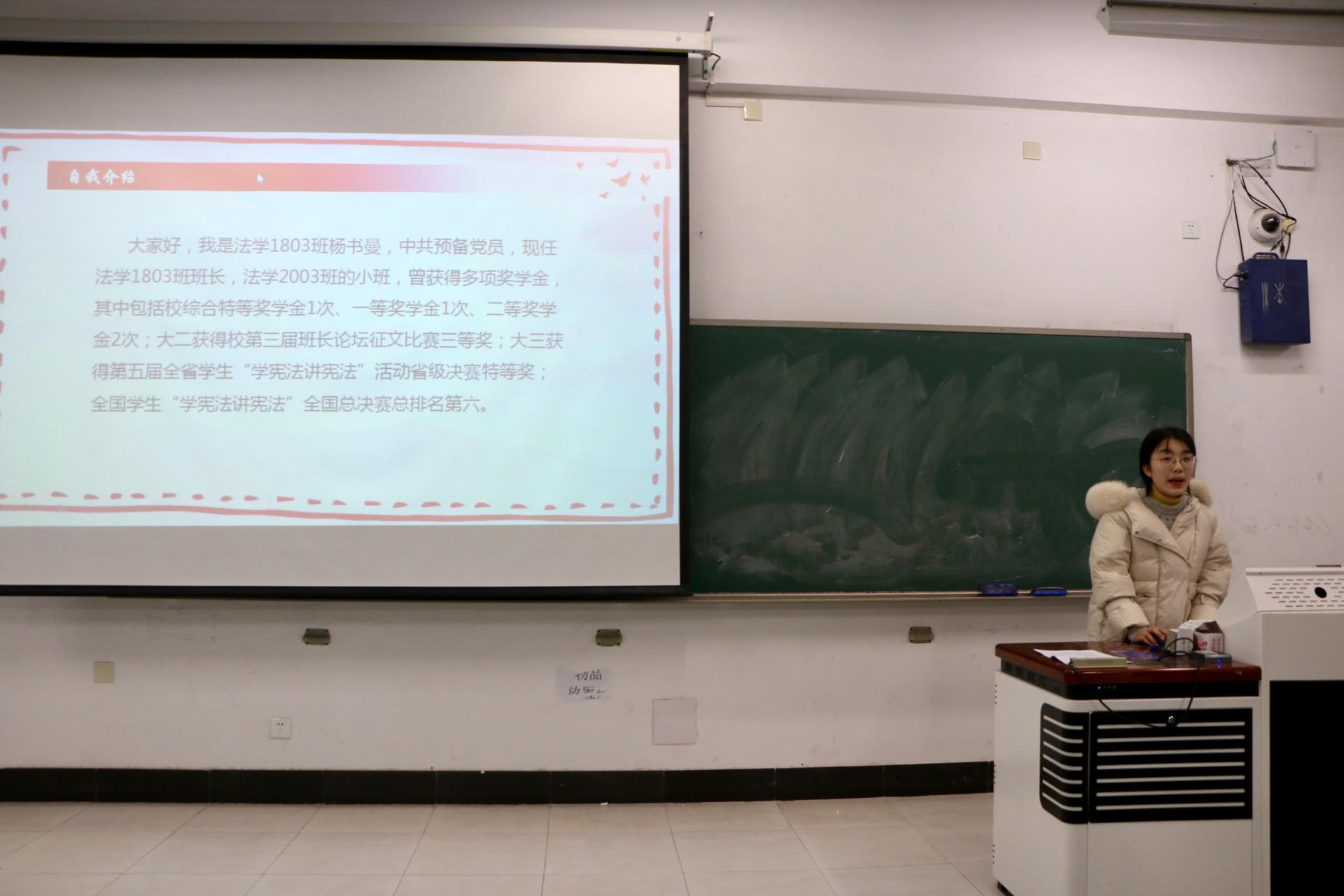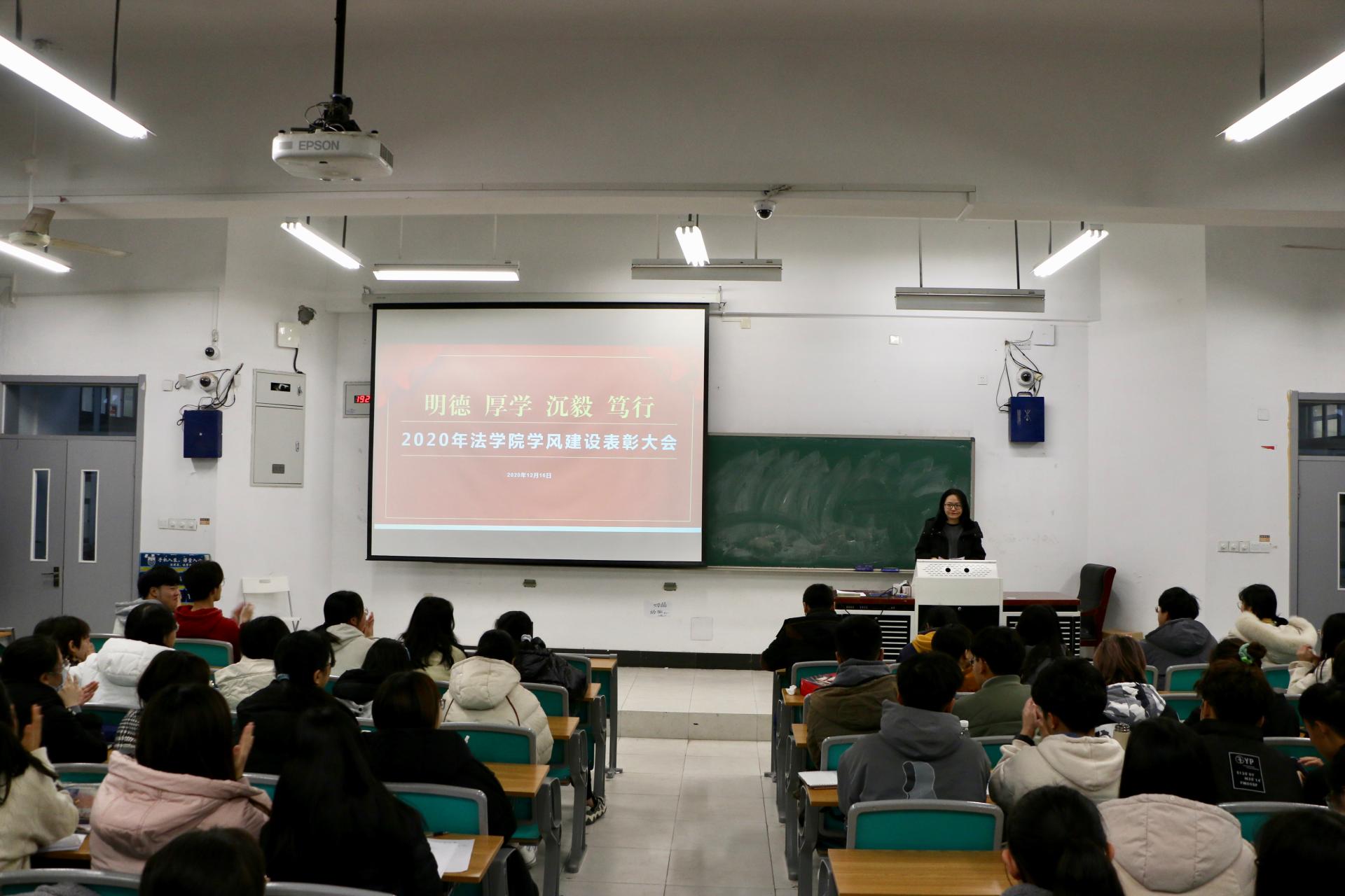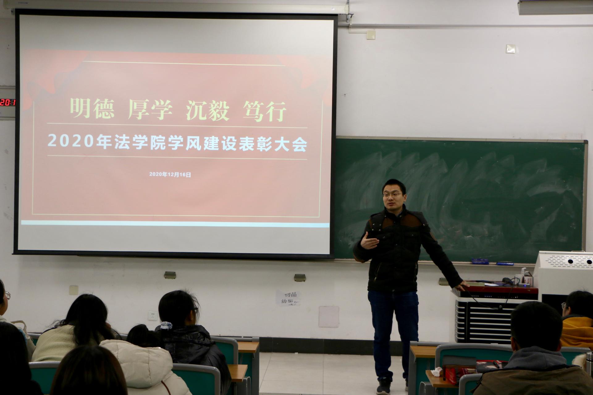 12月16日晚7点30分,法公司在厚学楼300教室举行学风建设表彰交流会。公司党委副书记朱忠祥老师、辅导员刘云老师、优秀员工代表以及2020级全体本科生参加大会。会议由院员工事务办公室主任曹蕾老师主持。