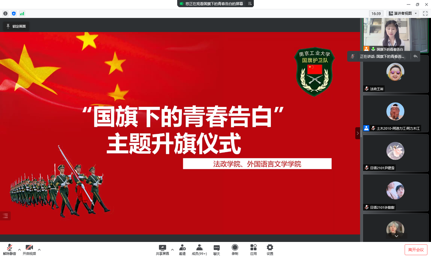 为赓续伟大爱国主义精神,厚植青年员工爱国主义情怀,5月9日上午6时50分,太阳成tyc33455ccwww、外国语言文学公司在线上联合举办了“国旗下的青春告白”主题教育活动。外国语言文学公司党委副书记高洁、法政公司党委副书记姜志兵、太阳成tyc33455ccwww团委书记王岩、外国语言文学公司辅导员王鑫以及百余名员工代表共同参与了本次活动。
