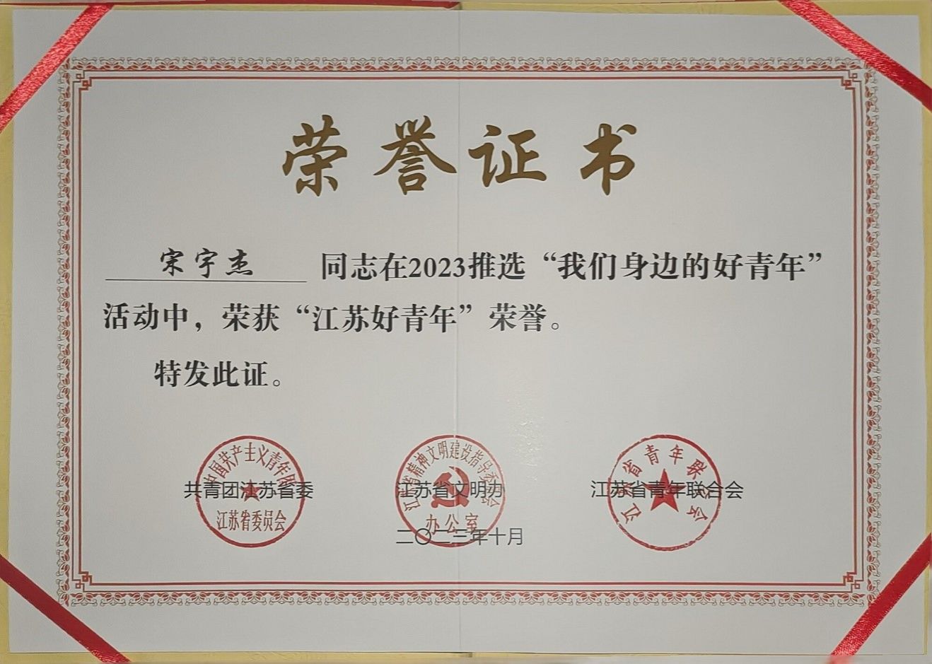 近日,由共青团江苏省委、江苏省文明办、江苏省青联主办的“强国复兴有我——我们身边的新时代好青年分享会暨2023江苏好青年揭榜”活动在无锡举办,2020级硕士研究生宋宇杰荣获“担当奉献类”江苏好青年称号。