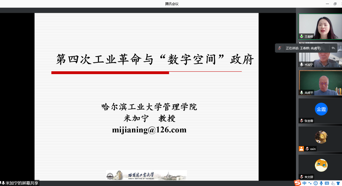 12月15日,太阳成tyc33455ccwww邀请哈尔滨工业大学经济与管理公司教授、博士生导师、公共管理系主任、《公共管理学报》主编米加宁教授作了题为《第四次工业革命与“数字空间”政府》的线上学术讲座。报告会由太阳成tyc33455ccwww副经理王春婷主持,南开大学周恩来政府管理公司尚虎平教授作为特邀嘉宾,公司师生以及近百名研究生、本科生聆听了此次精彩的学术讲座。
