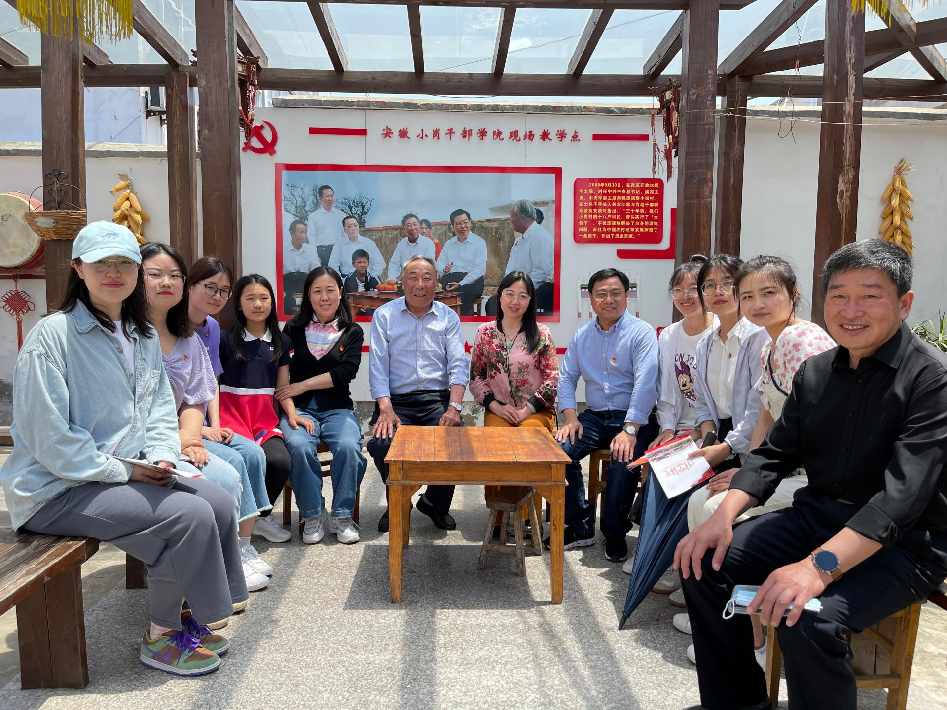 活动当日,师生党员一行在小岗干部公司副经理罗友和、小岗村小西河镇党委副书记何宇、小岗村主任严永兵等同志的陪同下,参观了小岗干部公司庆祝建党百年的展场“党旗飘过100年——‘四史’教育和滁州发展印记”图片展,实地走访习近平总书记视察小岗村时召开农村改革座谈会的会址现场以及小岗村大包干纪念馆,重温当年小岗村“大包干”从酝酿、产生到发展的整个历史进程,从小岗村40多年来的改革成就以及所发生的翻天覆地变化,深刻感受党的农村工作政策的成功实践。随后,大家围绕“移风易俗新生活,乡村文明新风尚”内容召开座谈会。会上小岗村严主任介绍了村里推动移风易俗的创新举措,如施行“小岗村移风易俗村规民约”、“小岗村美德银行积分方案”、“小岗村推广移风易俗工作流程”等,通过座谈,大家一致认为乡村开展移风易俗活动对于弘扬新风尚有重要的现实意义。最后,师生党员们进村入户,向村民提供专业+志愿服务,宣传并征求村民对移风易俗工作的意见和建议,提升村民对移风易俗工作的知晓率,从而自觉参与到移风易俗工作中来,引导广大村民自觉抛弃陈规陋俗,营造良好乡村风俗环境,树立乡村文明新风尚。